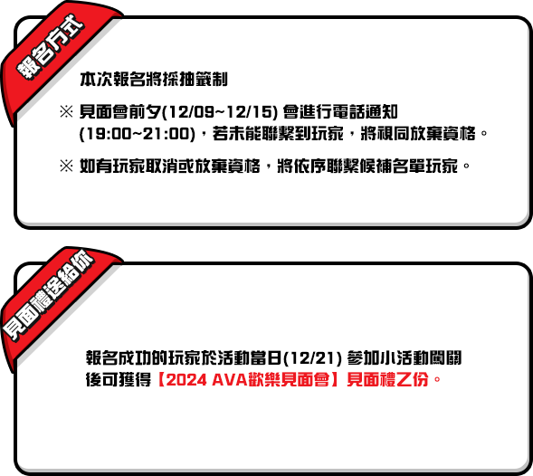 及相關規定條款之權利,變更事項將於官網公告說明, 請以官網最新公告為準。 - 本次參加見面會的所有玩家名單,將於2024/12/16(一) 19:00前官網公告,請密切留意官網資訊。
